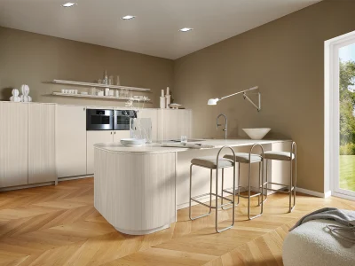Naast kleur speelt ook vorm een grote rol in de keuken van 2026. Ronde vormen en afgeronde hoeken zorgen voor een vriendelijke, uitnodigende uitstraling. Denk aan een sierlijk rond kookeiland, gebogen kastlijnen of vloeiende werkbladen. Deze organische vormen sluiten perfect aan bij de natuurlijke kleurentrends en versterken het gevoel van luxe en geborgenheid. De populaire Japandi-stijl blijft ook in 2026 een belangrijke inspiratiebron met lichte houtsoorten, minimalistische lijnen en een serene uitstraling.