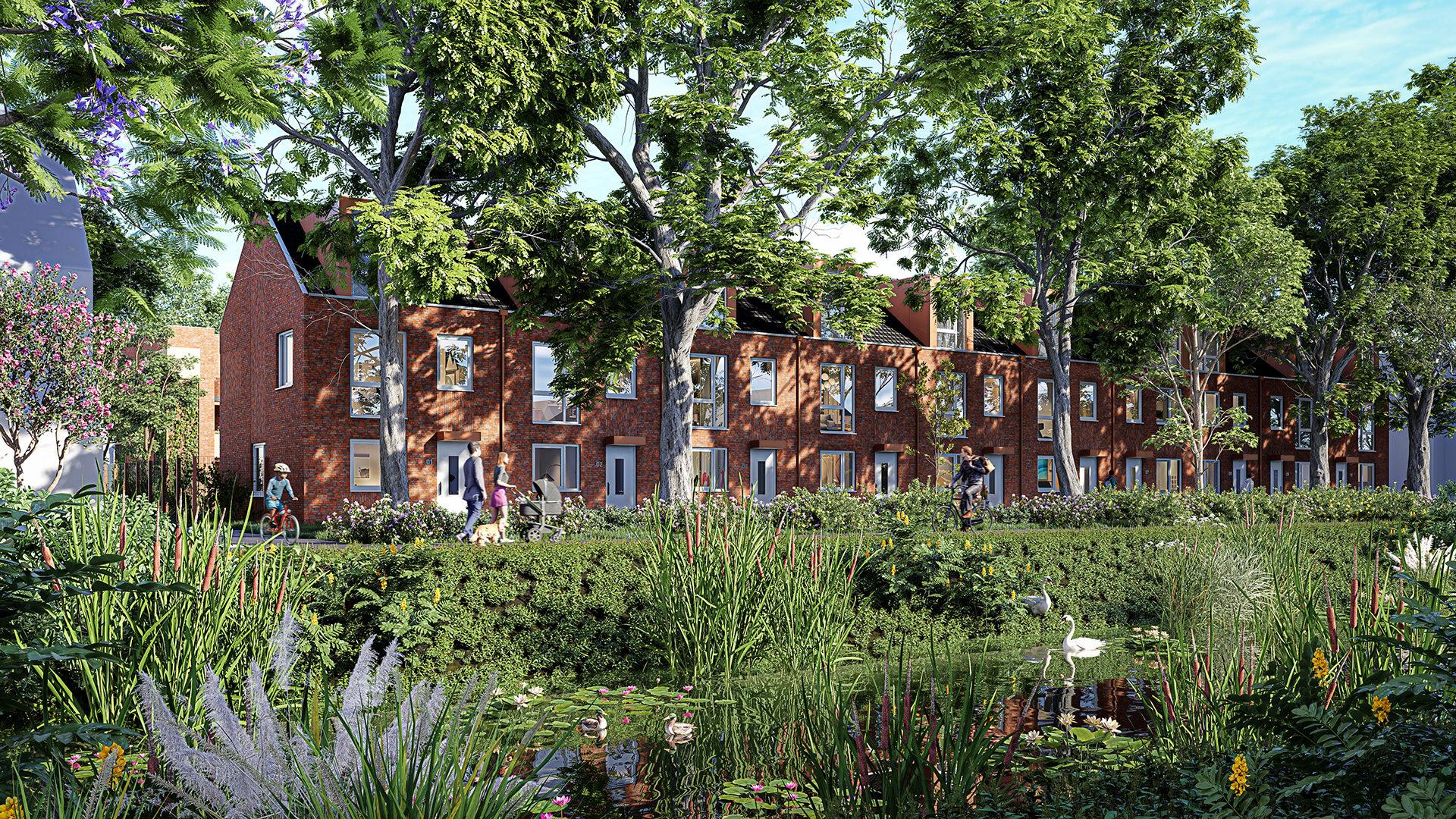 Het plan bestaat uit 24 comfortabele appartementen aan de zuidzijde van het gebied, met een vrij uitzicht over school Het Baken I en de gymzaal. Daarnaast worden er 10 eigentijdse rijwoningen gerealiseerd, met hun voorgevels gericht op de Prauw: het fietspad dat de wijk verbindt met de Rondweg-West en de Reede. Aan de achterzijde ligt een rustig parkeerhofje, terwijl de woningen aan de voorzijde uitkijken op een sfeervol beekje, omgeven door volwassen bomen.