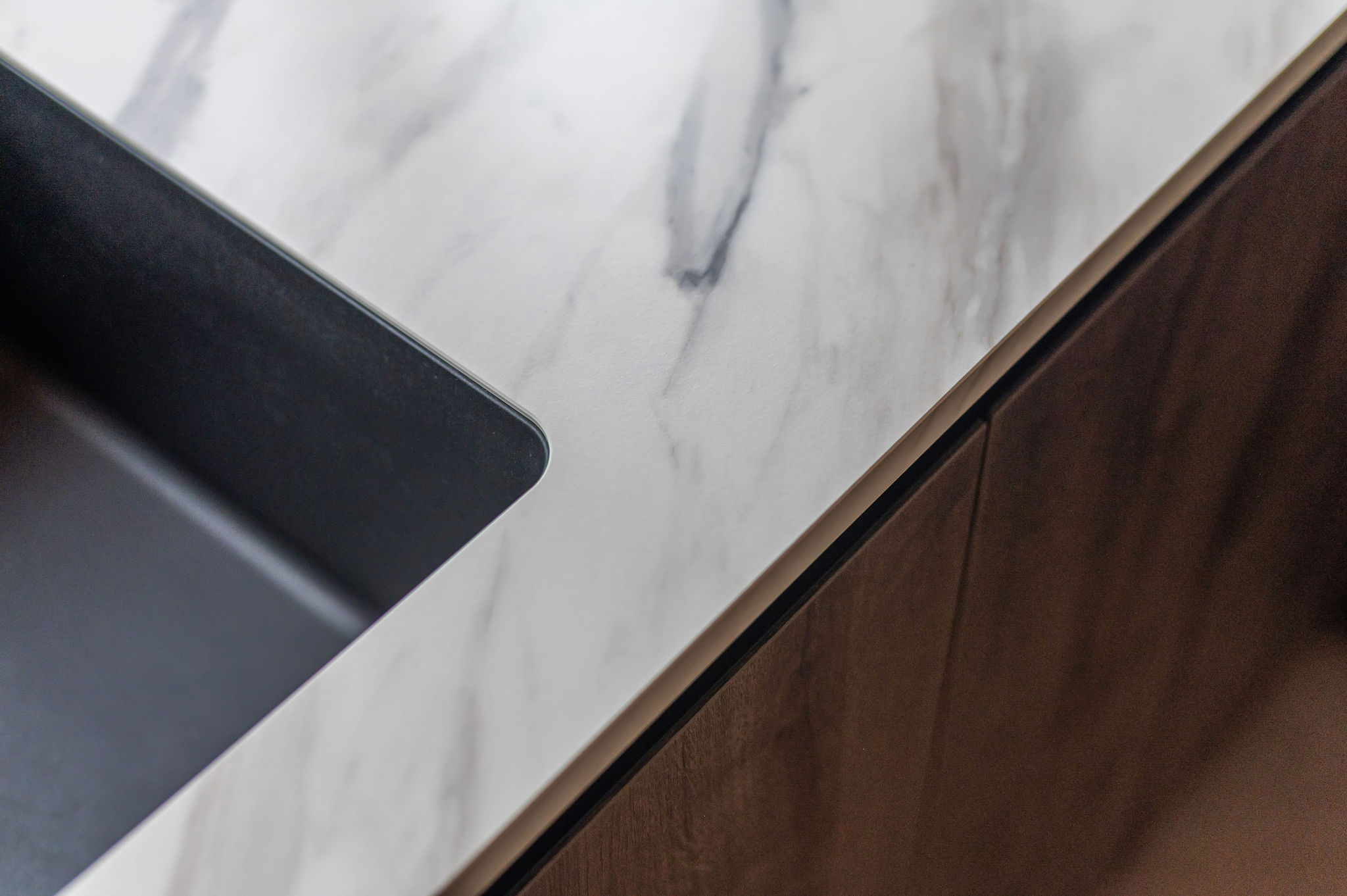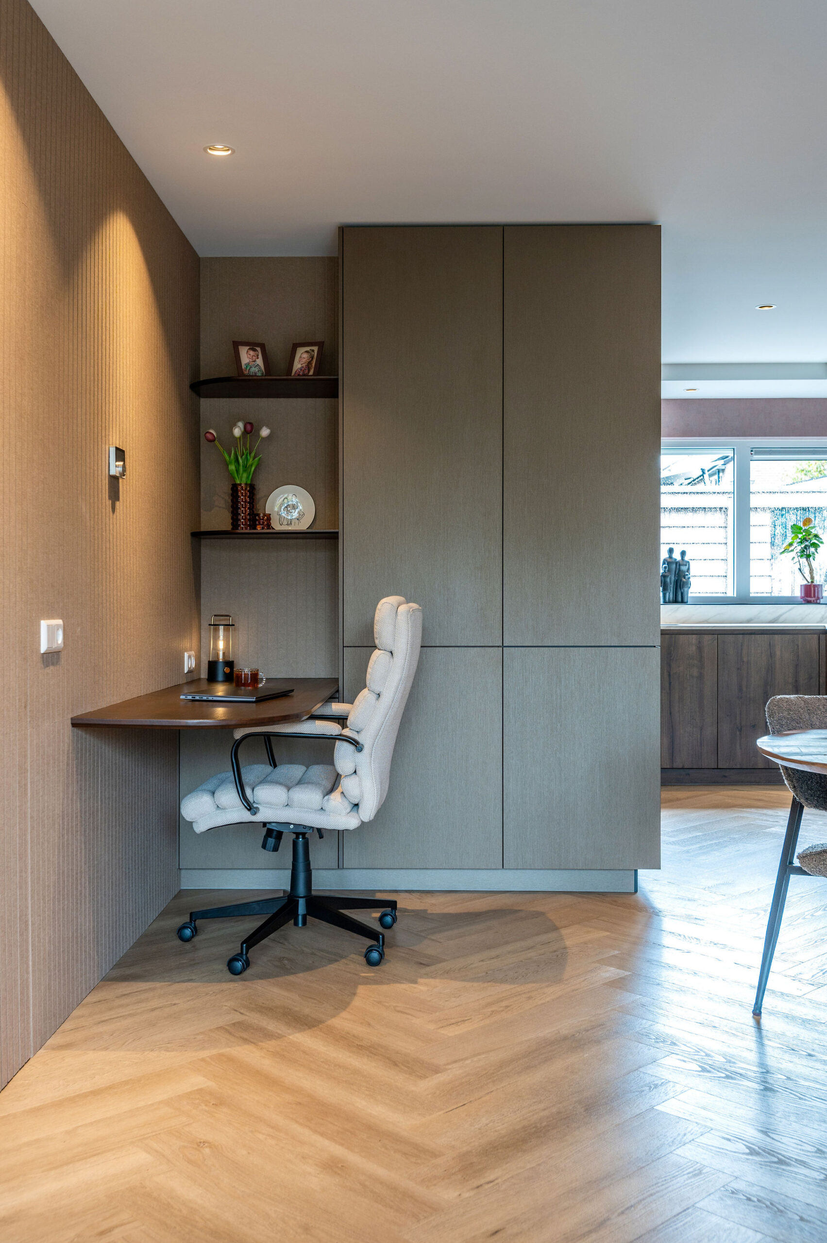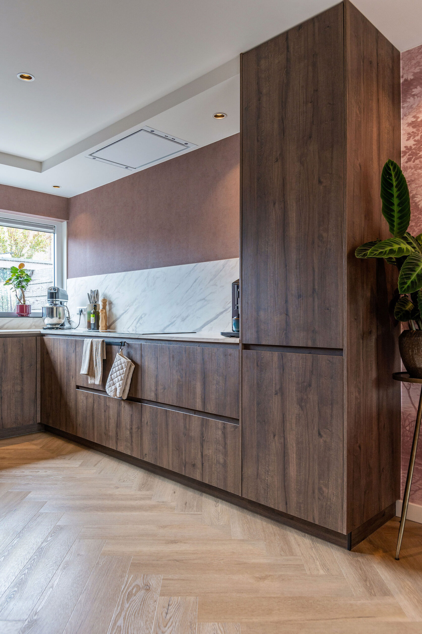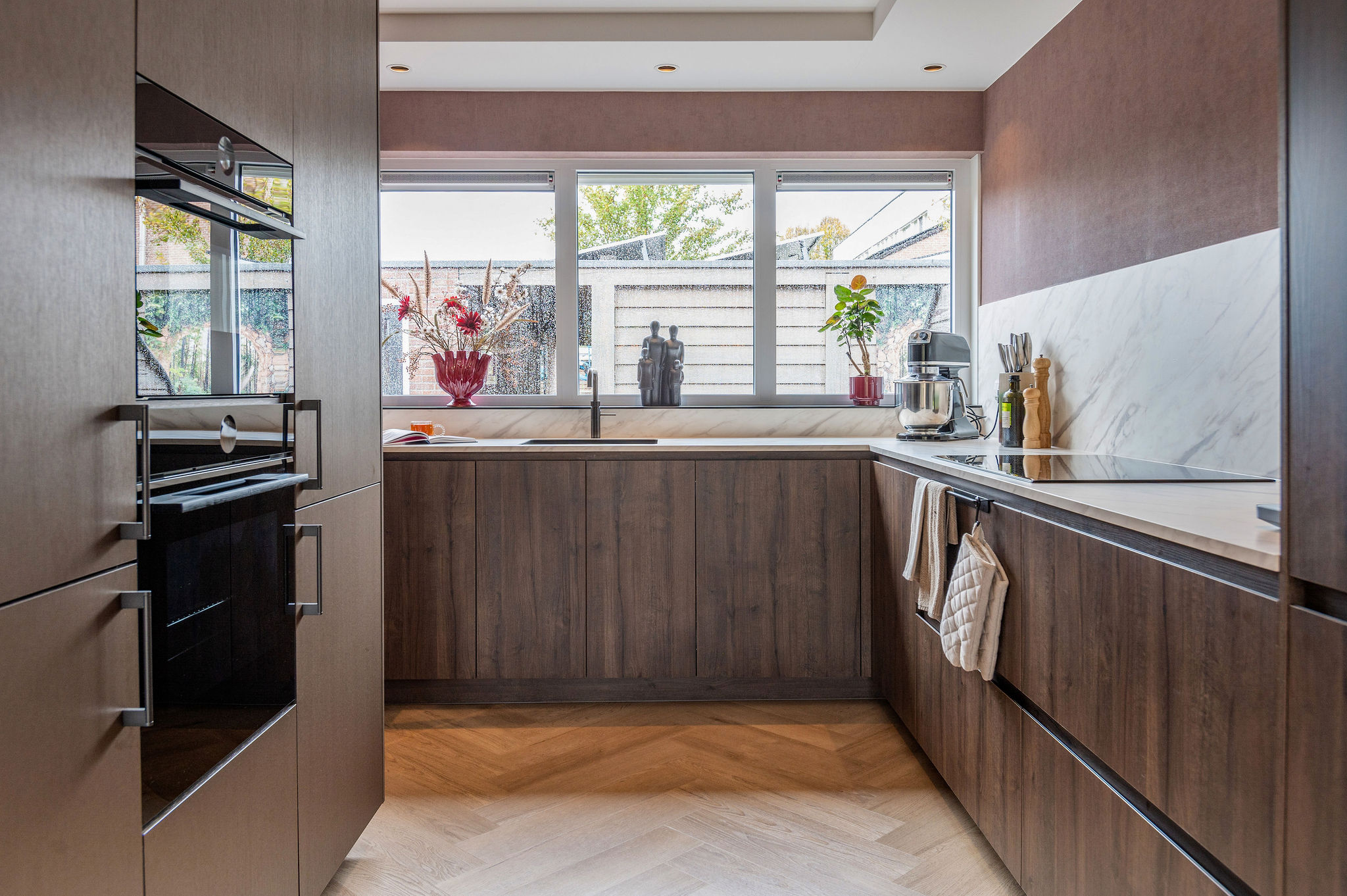 Extra werkruimte was belangrijk. ââIn de oude keuken hadden we bijna geen aanrechtbladââ, zegt Gerrianne. Ook opbergruimte stond hoog op het lijstje. ââWe wilden veel kastruimte, iets wat we eerder echt misten.ââ De doorlopende kastenwand bleek ideaal. âWe hebben hem om de hoek doorgetrokken, waardoor we extra kastruimte hebben gecreĂ«erdâ, vertelt ze. âIn één van de kasten staat zelfs een printer. Met één druk op de knop zet ik hem aan. Dat is voor mijn werk heel handig.ââDe apparatuur die het dagelijks koken makkelijker maakt