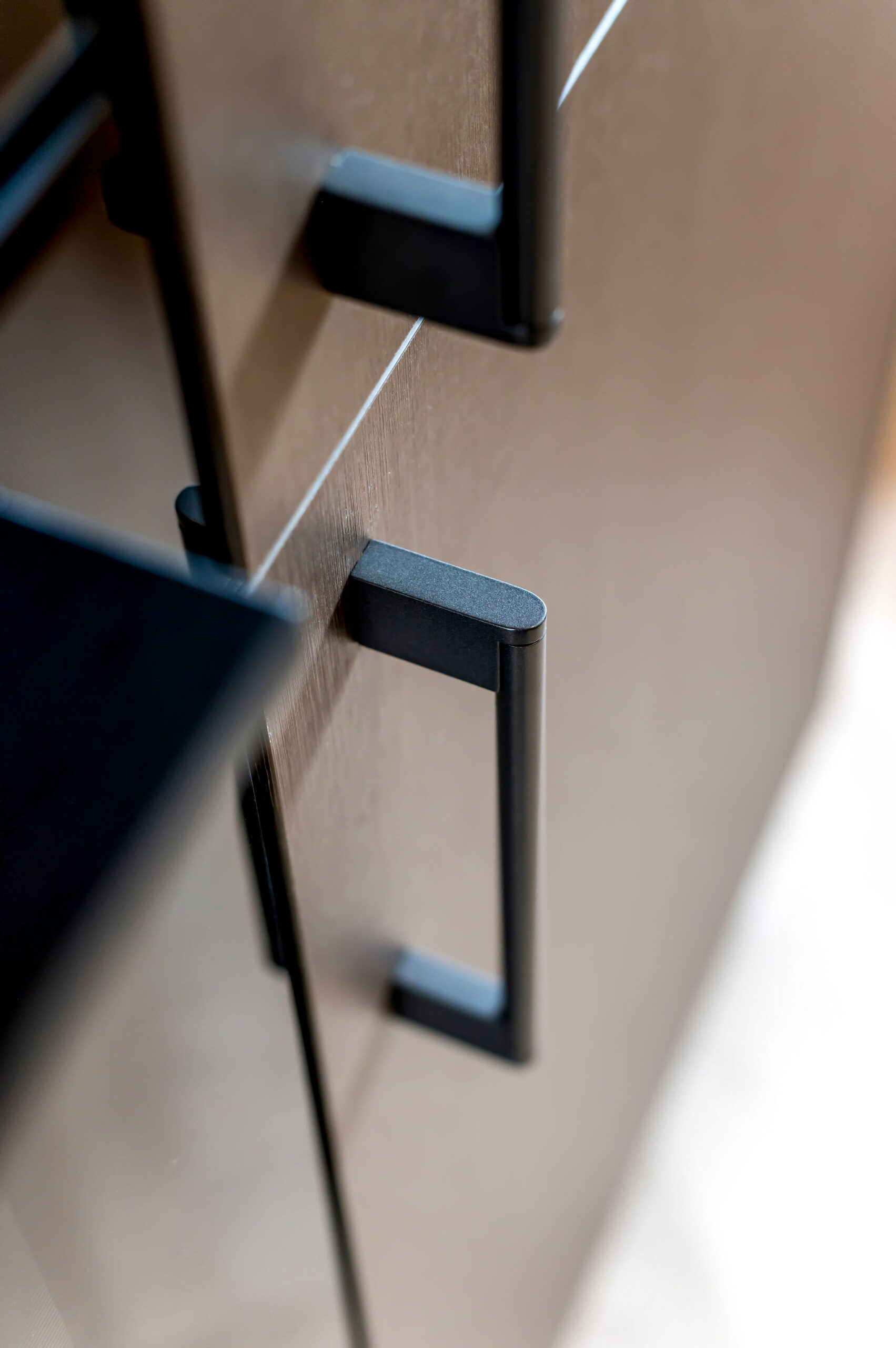 Over de uitstraling waren ze het snel eens. âRichard wist precies welke materialen hij graag wilde, en ik weet heel goed wat ik mooi vindâ, vertelt Gerrianne. âVoordat we bij Josbert zaten hadden we al besloten: een hoge kastenwand in een brons-grijze tint, de lage L in een donkere houtkleur en een licht blad erop.ââ De stijl omschrijft ze als stoer en rustig tegelijk. âDie bronskleur geeft iets stoers. Het geheel is heel rustig geworden. Door weinig accessoires te plaatsen gaat de aandacht volledig naar de keuken. Het is strak zonder saai te zijn.Slimme oplossingen voor extra ruimte en gemak