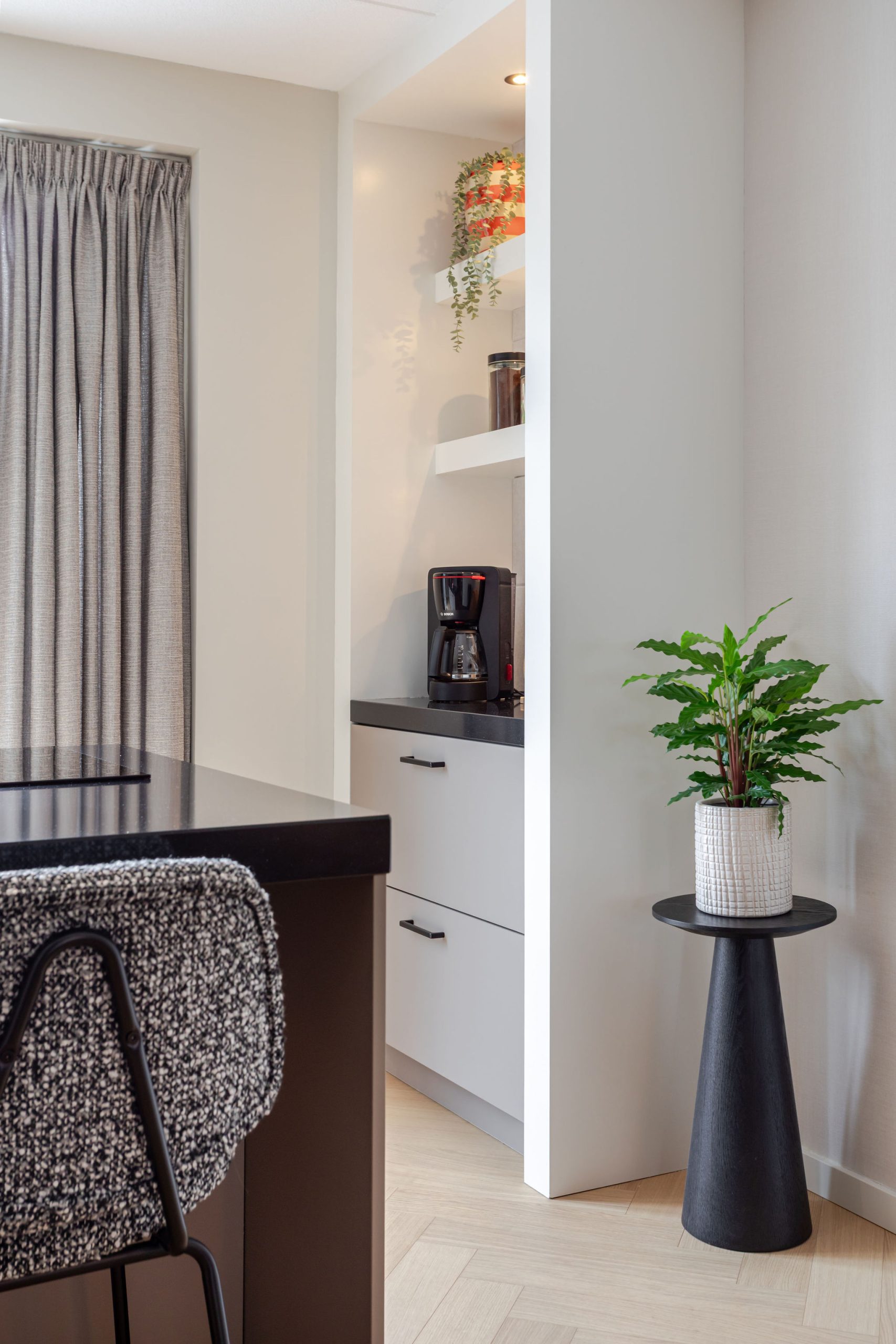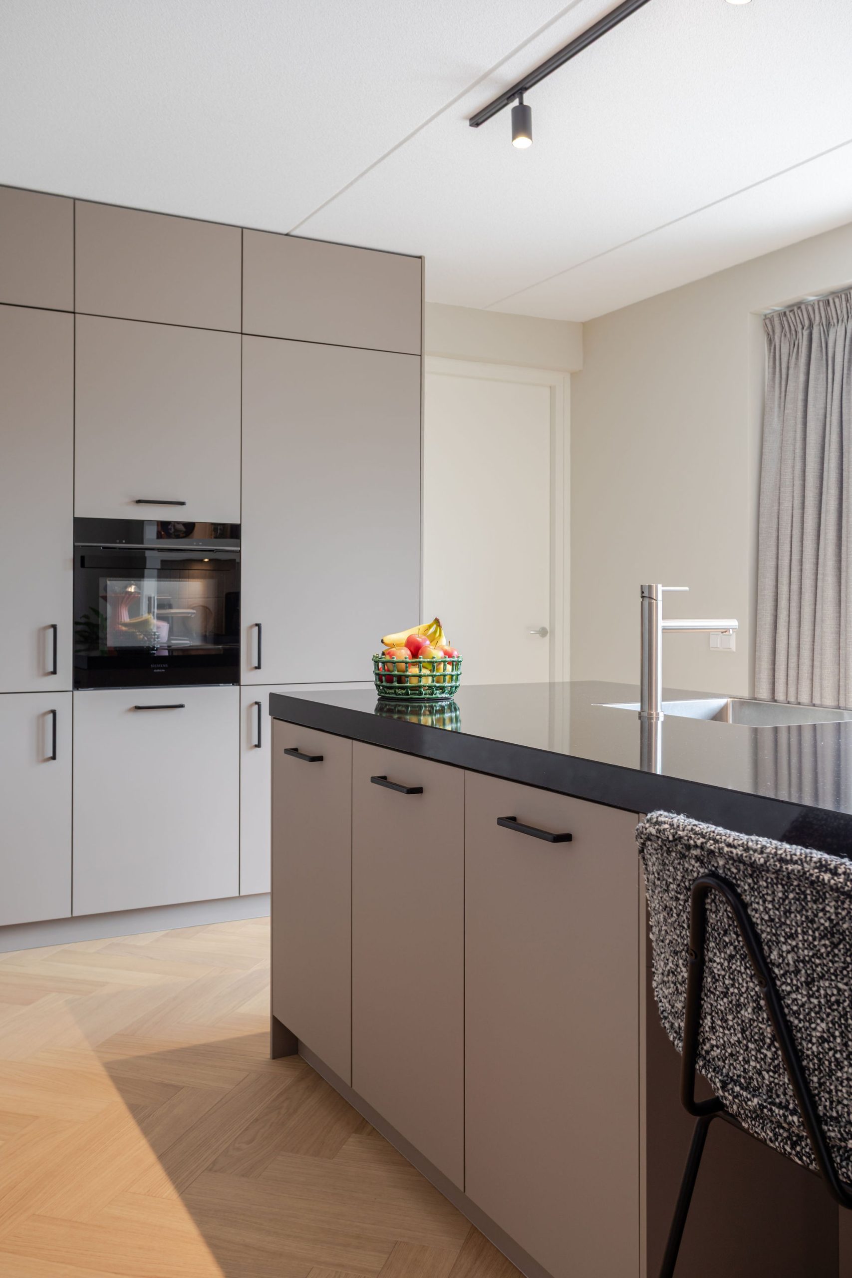 “Het is vooral een keuken die echt bij ons past.” Dat betekent bijvoorbeeld geen Quooker, maar wél een combi-oven en een XXL-koelkast. “We zijn dicht bij onszelf gebleven en hebben bewust gekozen voor wat wij belangrijk vinden. Koken op inductie was in het begin even wennen, maar inmiddels willen we niet anders. We koken vrijwel elke dag en de combi-oven wordt meerdere keren per week gebruikt.” Het composieten werkblad hebben we gekozen met het oog op duurzaamheid. “We wilden een sterk en krasbestendig materiaal waar we jarenlang plezier van hebben.” Ook de hoge kastenwand tot aan het plafond was een bewuste keuze. “Zo benut je de ruimte optimaal, en een bijkomend voordeel is dat je er niet bovenop hoeft te stoffen.” De coffee corner vormt een speelse toevoeging aan het geheel. “Dat geeft de keuken net wat extra karakter.” De dimbare spots zorgen daar bovendien voor extra sfeer. Wat ze vooral waarderen in het hele traject is meedenken zonder sturing. “Een goed voorbeeld daarvan was de keuze voor de bar. De voor- en nadelen werden benoemd, maar de keuze was echt voor ons. Dat was heel prettig samenwerken.”